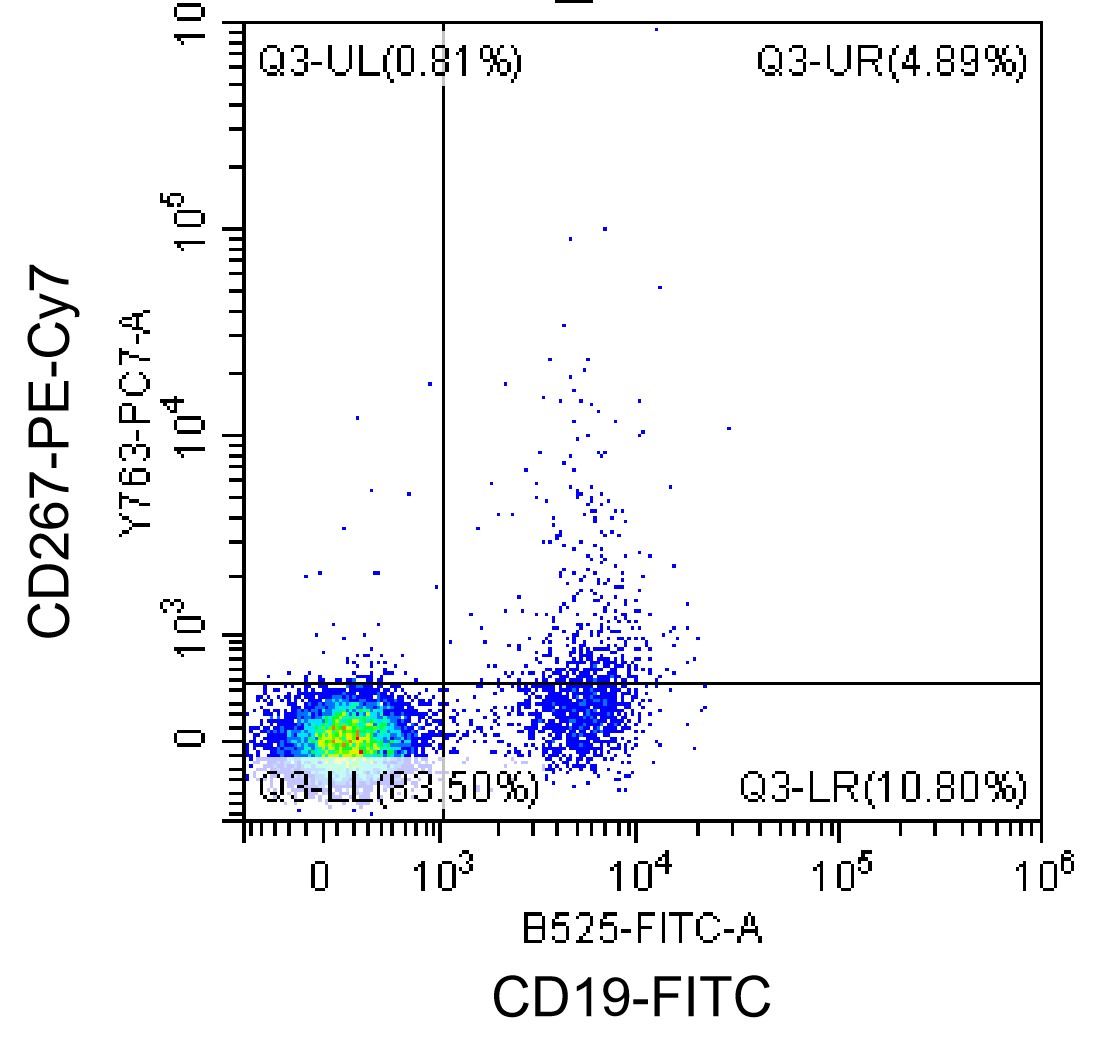 • Staining normal human peripheral blood mononuclear cells (PBMCs) with PE-Cy7 Human CD267/TACI Antibody (Clone: 1A1) (Product Number: H2719) and FITC CD19 Antibody. Analysis was performed on live lymphocytes.