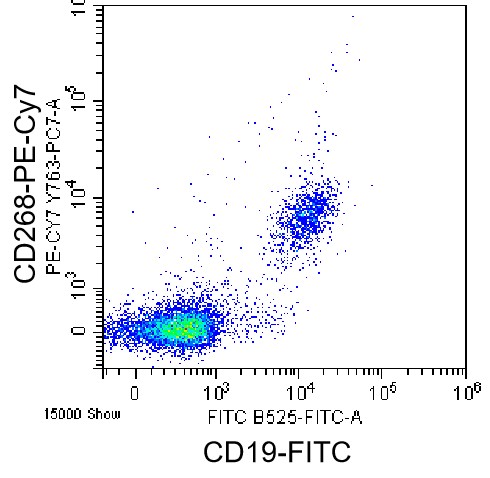 • Staining of normal human peripheral blood mononuclear cells (PBMCs) using FITC CD19 Antibody and PE-Cy7 Human CD268/BAFF-R Antibody (Clone: 11C1) (Catalog Number: H2164). Analysis data derived from lymphocytes.