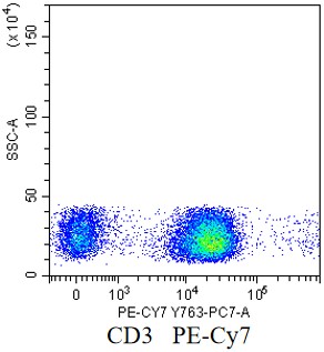 • Staining of normal human peripheral blood mononuclear cells (PBMCs) using PE-CY7 Anti-Human CD3 Antibody (Clone: OKT-3) (Product No.: H4279). Analyzed data are derived from lymphocytes.