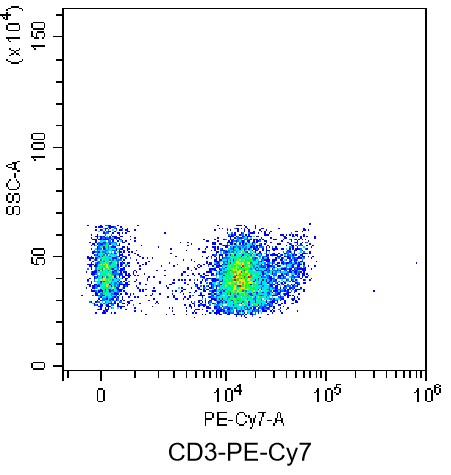 • Staining of normal human peripheral blood mononuclear cells (PBMCs) with PE-Cy7 anti-human CD3 Antibody (Clone: UCHT1) (Product Code: H4354). Analysis data derived from lymphocytes.