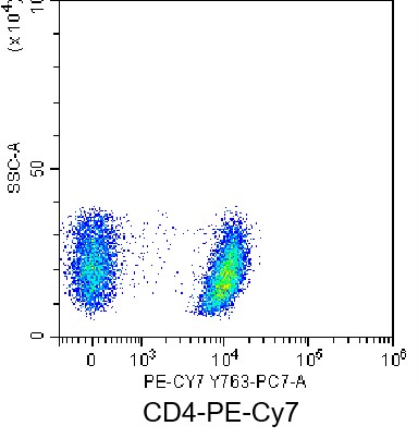 • Staining of normal human peripheral blood mononuclear cells (PBMCs) using PE-CY7 Anti-Human CD4 Antibody (Clone: L200) (Product No.: H0049). Analyzed data are derived from lymphocytes.