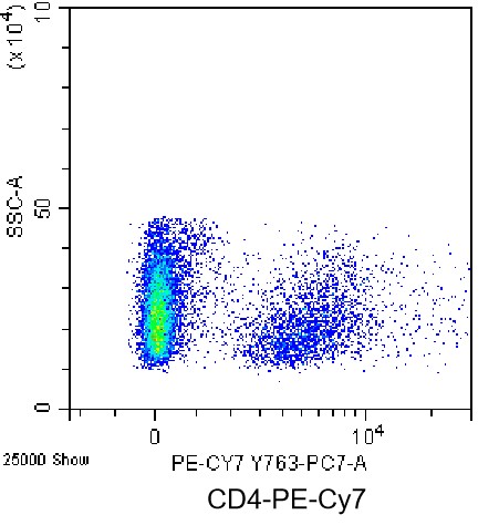 • Staining of normal human peripheral blood mononuclear cells (PBMCs) using PE-CY7 Anti-Human CD4 Antibody (Clone: RPA-T4) (Product No.: H0034). Analyzed data are derived from lymphocytes.
