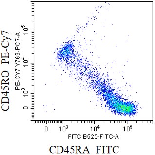 • Staining of normal human peripheral blood mononuclear cells (PBMCs) using FITC Anti-CD45RA Antibody and PE-CY7 Anti-Human CD45RO Antibody (Clone: UCHL1) (Product No.: H4009). Analyzed data are derived from lymphocytes.