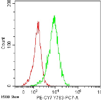 • Staining of normal human peripheral blood mononuclear cells (PBMCs) using PE-CY7 Anti-Human CD54 Antibody (Clone: HA58) (Product No.: H1249) (green, red is blank control). Analyzed data are derived from lymphocytes.