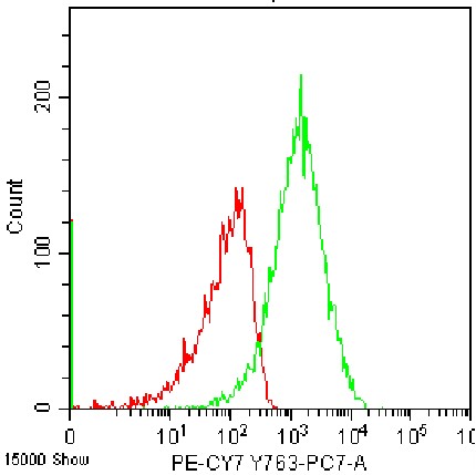 • Staining of platelet-enriched normal human peripheral blood using PE-CY7 Anti-Human CD63 Antibody (Clone: H5C6) (Product No.: H1324) (green, red is blank control). Analyzed data are derived from lymphocytes.