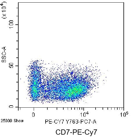 • Staining of normal human peripheral blood mononuclear cells (PBMCs) (green) using PE-Cy7 Human CD7 Antibody (Clone: 124-1D1) (Catalog Number: H3994) and blank cells (red). Analysis data derived from lymphocytes.
