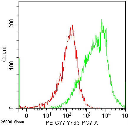 • Staining of normal human peripheral blood mononuclear cells (PBMCs) using PE-Cy7 Human CD82 Antibody (Clone: ASL-24) (Selleck Cat#: H3874) (Green, Red: Blank Control). Analyzed data are derived from lymphocytes.