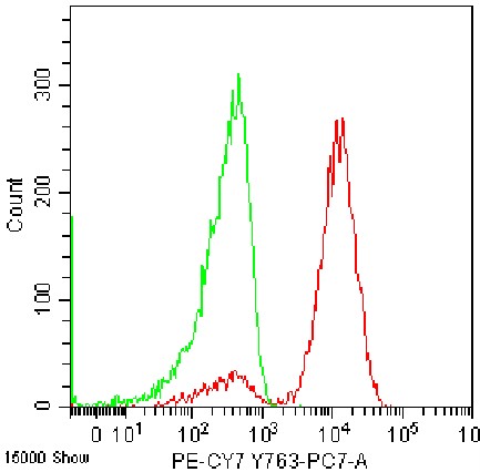 • Staining of Jurkat cell line cells using PE-CY7 Anti-Human CD90 Antibody (Clone: 5E10) (Product No.: H0304) (red, green is unstained control). Analyzed data are derived from live cells.