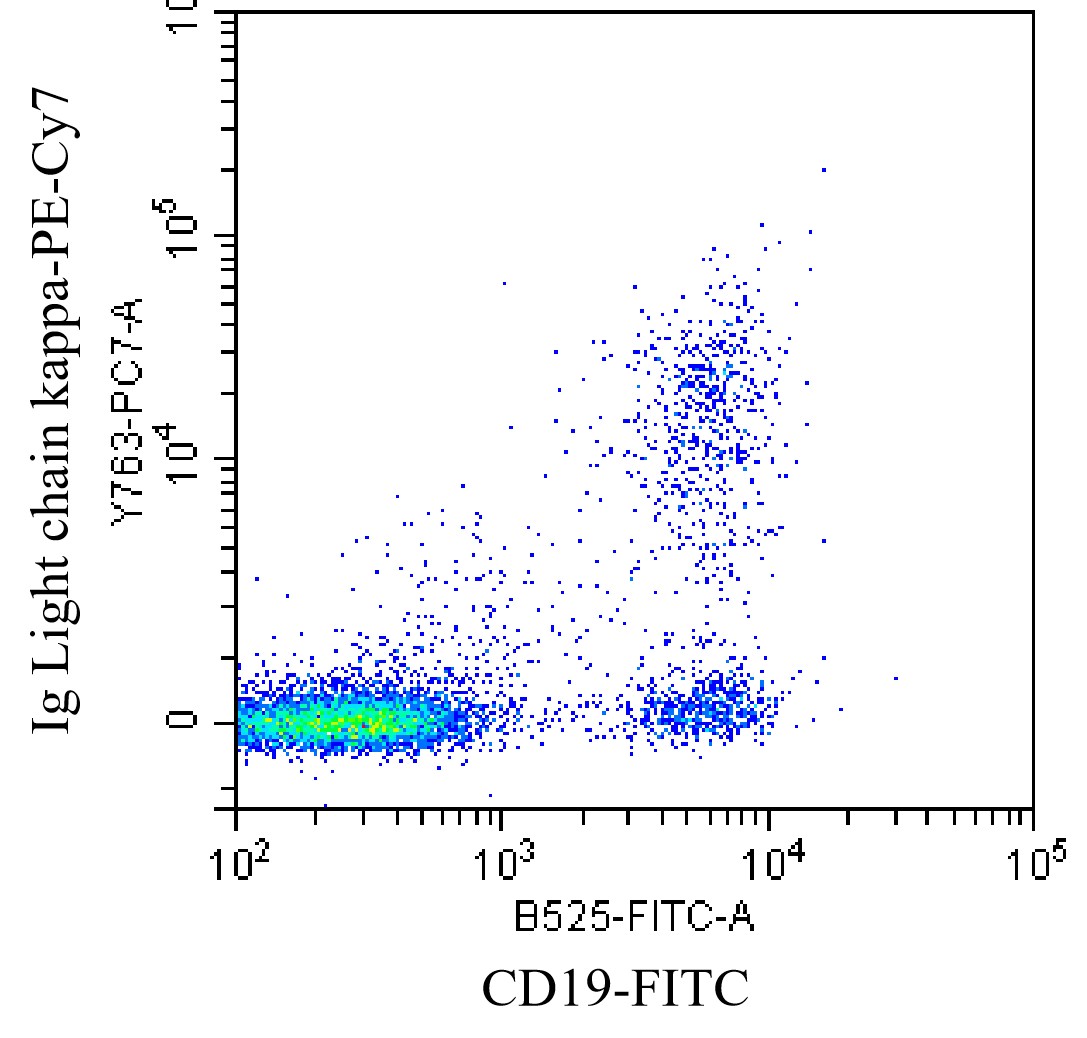 • Staining normal human peripheral blood mononuclear cells (PBMCs) with FITC CD19 Antibody and PE-Cy7 Human Ig light chain κ Antibody (Clone: MHK-49) (Product Number: H3664). Analysis was performed on lymphocytes.