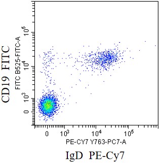 • Staining of normal human peripheral blood mononuclear cells (PBMCs) using FITC Anti-CD19 Antibody and PE-CY7 Anti-Human IgD Antibody (Clone: IA6-2) (Product No.: H3694). Analyzed data are derived from lymphocytes.