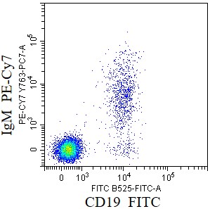 • Staining of normal human peripheral blood mononuclear cells (PBMCs) blocked with Human Fc Block using FITC Anti-CD19 Antibody and PE-CY7 Anti-Human IgM Antibody (Clone: MHM-88) (Product No.: H1009). Analyzed data are derived from lymphocytes.