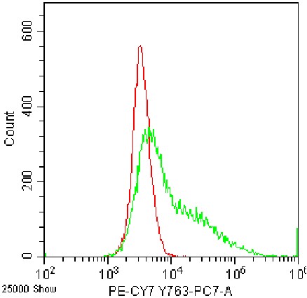 • Staining of fixed/permeabilized HEK-293F cells transfected with Human, IFN gamma cDNA ORF Clone, Flag plasmid using PE-Cy7 Anti-IFN-gamma Antibody (Clone: 4S.B3) (Product No.: H0124). Analyzed data are derived from total cells.