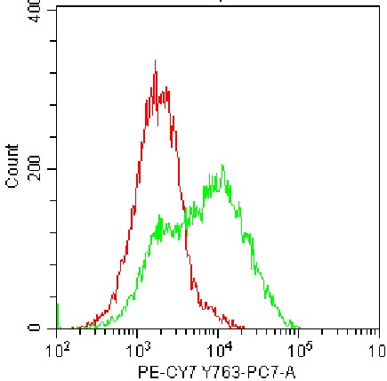 • Staining of fixed/permeabilized HEK-293F cells transfected with human IL-17A plasmid using PE-Cy7 IL-17A Antibody (Clone: G2J2) (Selleck CatNo.: G0184) (Green, Red: Blank Control). Analyzed data are derived from total cells.