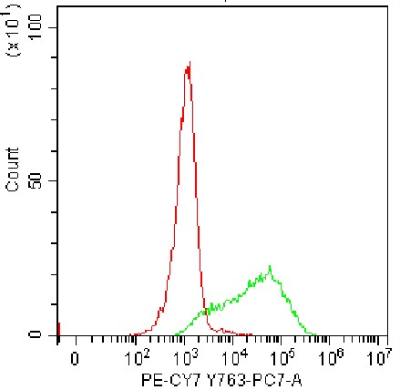 • Staining of fixed/permeabilized HEK-293F cells transfected with human IRF4 (IL-18Rα) plasmid using PE-Cy7 IRF4 Antibody (Clone: 3E4) (Selleck CatNo.: G2539) (Green, Red: Blank Control). Analyzed data are derived from total cells.