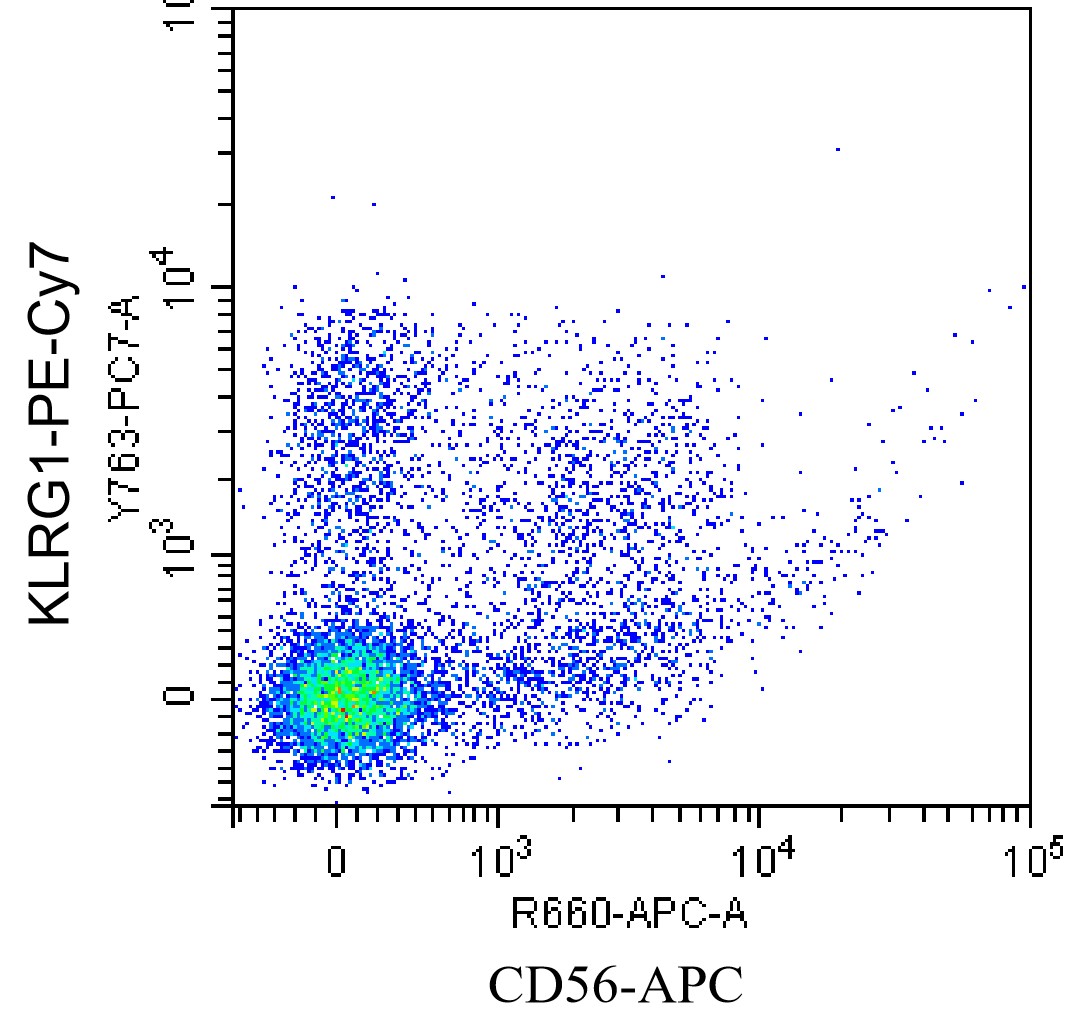• Staining normal human peripheral blood mononuclear cells (PBMCs) with PE-Cy7 KLRG1 Antibody (Clone: 13F12F2) (Product Number: H3724) and APC CD56 Antibody. Analysis was performed on live lymphocytes.