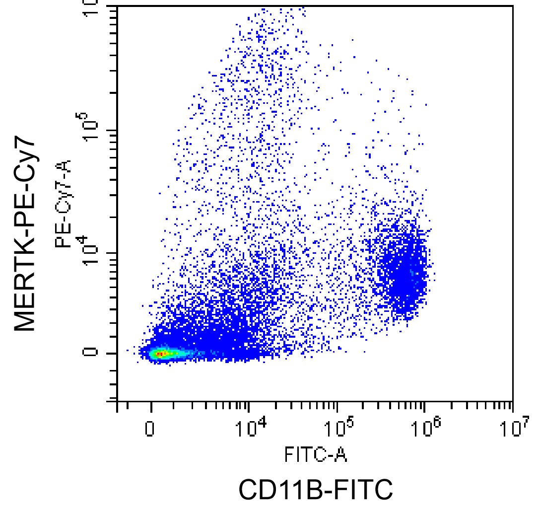 • Staining C57BL/6 mouse ascites cells with PE-Cy7 MERTK Antibody (Clone: DS5MMER1) (Product Number: G1969) and FITC CD11b Antibody. Analysis was performed on live cells.