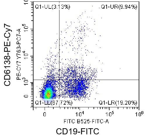 • Staining of bone marrow cells from C57BL/6 mice using FITC Anti-CD19 Antibody and PE-CY7 Anti-Mouse CD138 Antibody (Clone: 281-2) (Product No.: G4114). Analyzed data are derived from live lymphocytes.