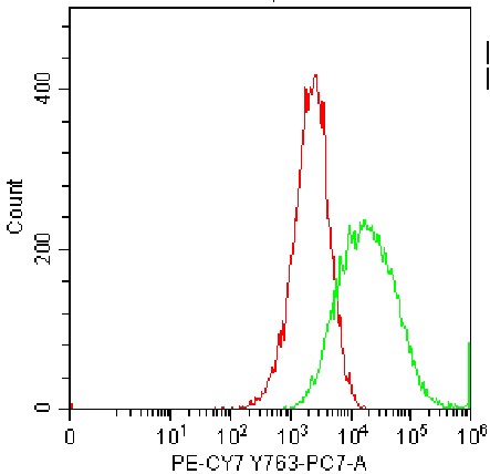 • Staining of bEnd.3 cells (green) using PE-Cy7 Mouse CD146 Antibody (Clone: ME-9F1) (Catalog Number: G0979) and blank control (red). Analysis data derived from live lymphocytes.