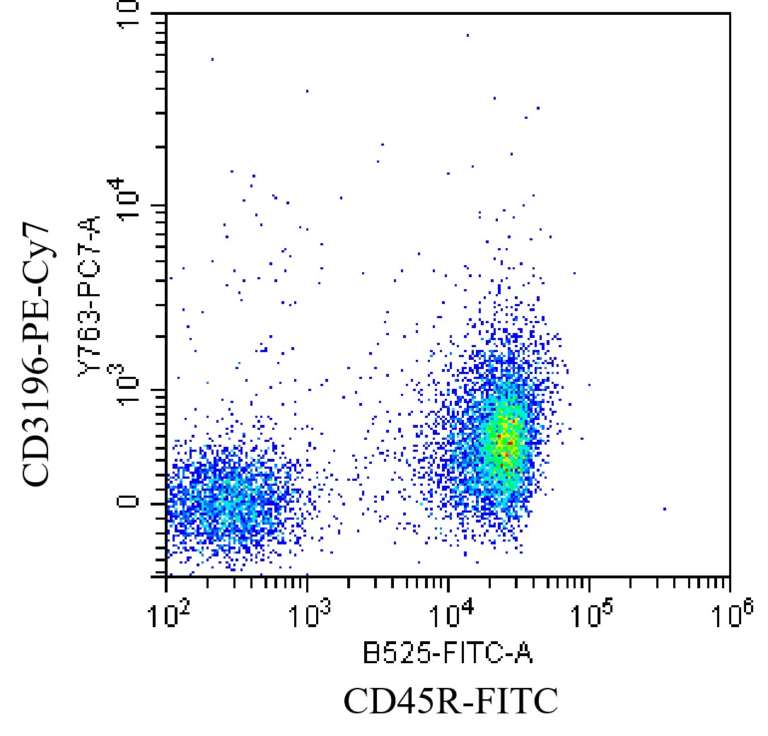 • Staining C57BL/6 mouse splenocytes with FITC CD45R Antibody and PE-Cy7 Mouse CD196/CCR6 Antibody (Clone: 29-2L17) (Product Number: G3019). Analysis was performed on live lymphocytes.