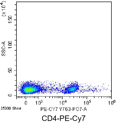• Staining of splenic lymphocytes from C57BL/6 mice using PE-CY7 Anti-Mouse CD4 Antibody (Clone: GK1.5) (Product No.: G4144). Analyzed data are derived from live lymphocytes.