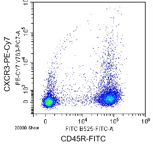 • Staining of splenic lymphocytes from C57BL/6 mice using FITC Anti-CD45R Antibody and PE-CY7 Anti-Mouse CXCR3 Antibody (Clone: CXCR3-173) (Product No.: G4369). Analyzed data are derived from live lymphocytes.