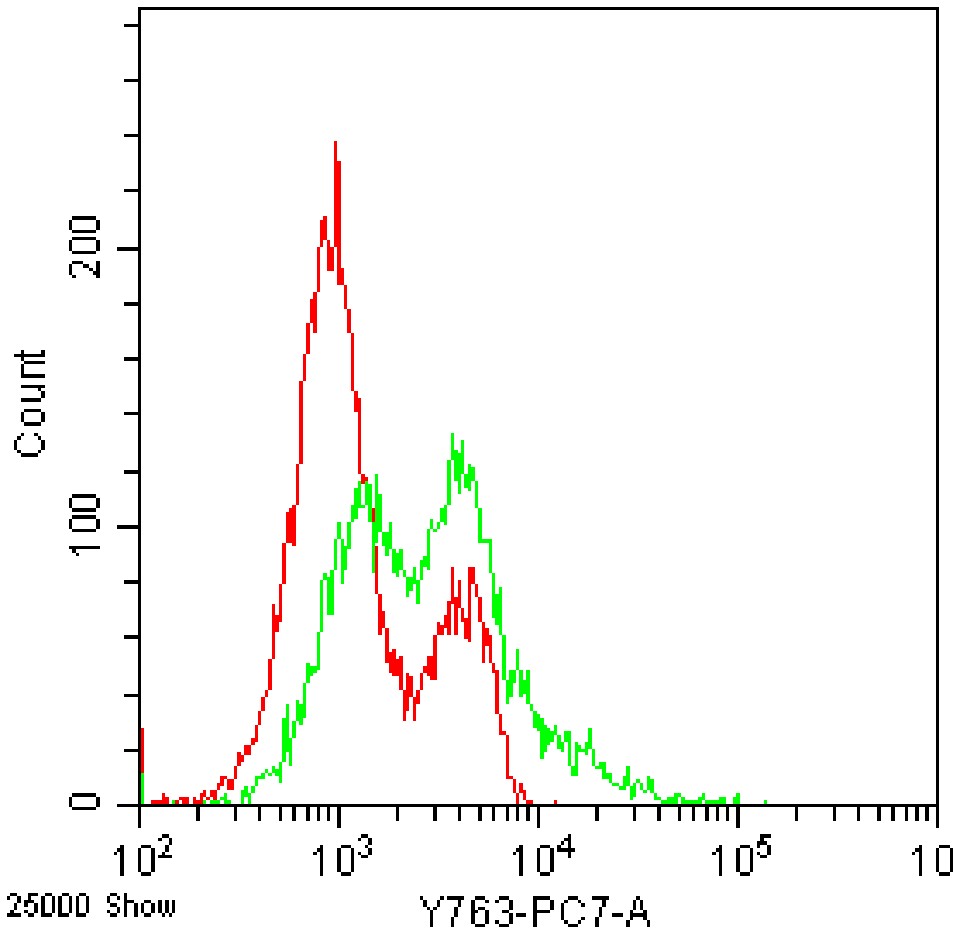 • Staining HEK-293F cells transfected with pLV3-CMV-Ccl2(mouse)-Csf2(mouse)-CopGFP-Puro plasmid and fixed/permeabilized with fixation/permeabilization buffer with PE-Cy7 Mouse GM-CSF Antibody (Clone: MP1-22E9) (Product Number: G4819) (green, red is unstained control). Analysis was performed on total cells.