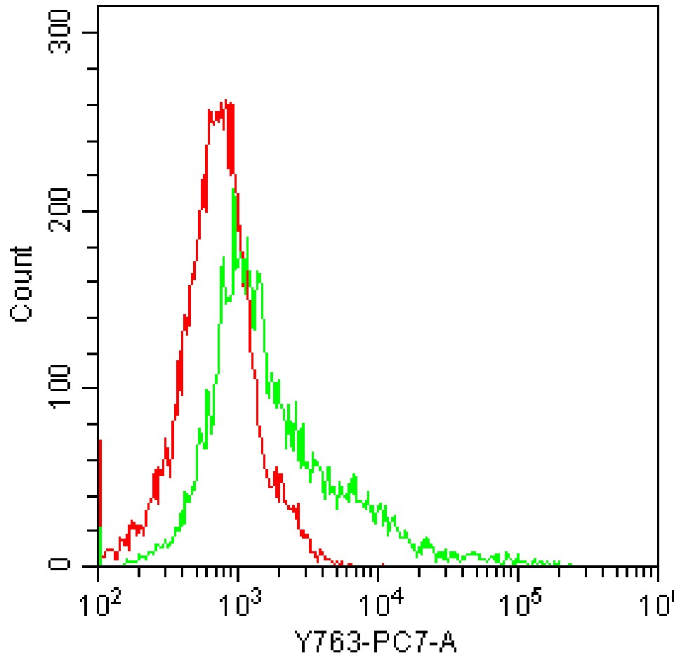 • Staining HEK-293F cells transfected with mouse IFN-γ plasmid and fixed/permeabilized with fixation/permeabilization buffer with PE-Cy7 Mouse IFNγ Antibody (Clone: R4-6A2) (Product Number: G4174) (green, red is unstained control). Analysis was performed on total cells.