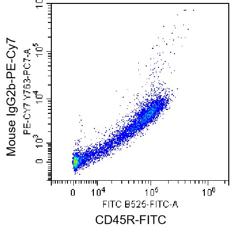 • Staining of normal human peripheral blood mononuclear cells (PBMCs) using PE-Cy7 Mouse IgG2b Antibody (Clone: RMG2b-1) (Selleck Cat#: G3184) and FITC CD45RA Antibody. Analyzed data are derived from lymphocytes.