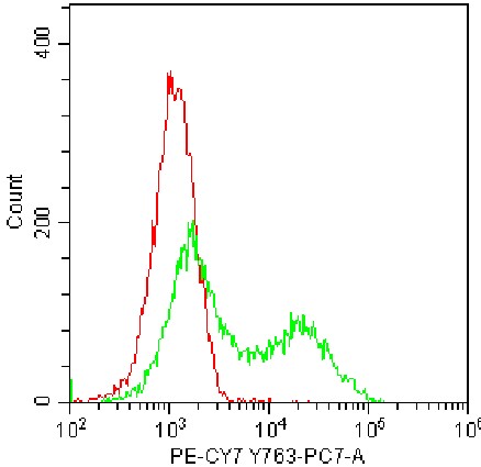 • Staining of permeabilized HEK-293F cell line cells transfected with pCMV-Il10(mouse)-3×FLAG-Neo plasmid (permeabilized using fixation/permeabilization buffer) using PE-CY7 Anti-Mouse IL-10 Antibody (Clone: JES5-16E3) (Product No.: G0784) (green, red is unstained control). Analyzed data are derived from total cells.