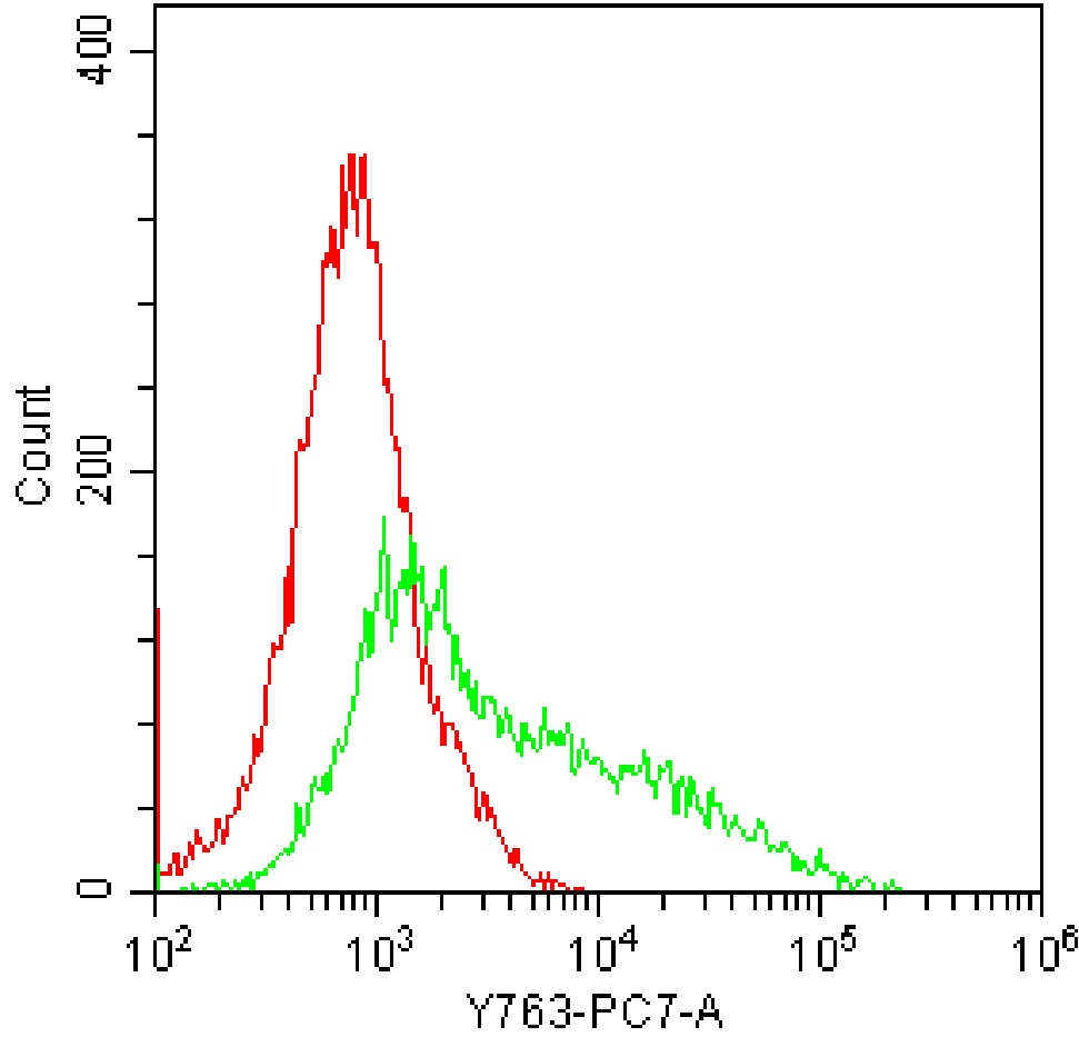 • Staining HEK-293F cells transfected with pCMV-Il2rb(mouse)-3×FLAG-Neo plasmid and fixed/permeabilized with fixation/permeabilization buffer with PE-Cy7 Mouse IL-2 Antibody (Clone: JES6-5H4) (Product Number: G1069) (green, red is unstained control). Analysis was performed on total cells.