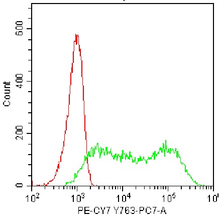 • Staining of fixed/permeabilized HEK-293F cells transfected with mouse LAG-3 plasmid using PE-Cy7 Mouse LAG-3 Antibody (Clone: C9B7W) (Product No.: G4324) (Green, Red: Blank Control). Analyzed data are derived from total cells.