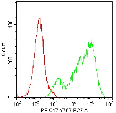 • Staining of fixed/permeabilized HEK-293F cells transfected with mouse LAP(TGF-β1) plasmid using PE-Cy7 Mouse LAP/TGF-β1 Antibody (Clone: TW7-16B4) (Product No.: G1639) (Green, Red: Blank Control). Analyzed data are derived from total cells.