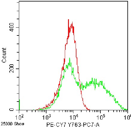• Staining of fixed/permeabilized HEK-293F cells transfected with pCMV-TIGIT(mouse)-SV40-Neo plasmid using PE-Cy7 mouse TIGIT Antibody (Clone: 1G9) (Product No.: G4894) (Green, Red: Blank Control). Analyzed data are derived from total cells.