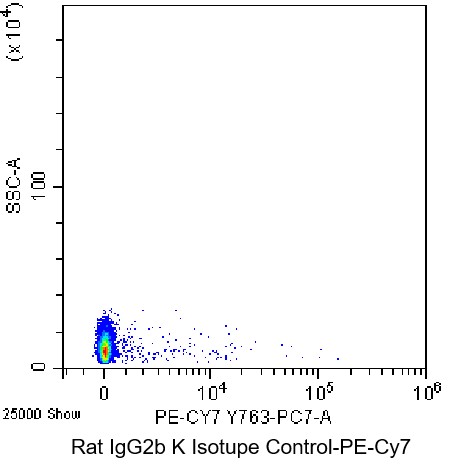 • Staining of C57BL/6 mouse splenic lymphocytes using PE-Cy7 Rat IgG2b κ Isotype Control Antibody (Clone: eB149/10H5) (Catalog Number: G0889). Analysis data derived from total cells.