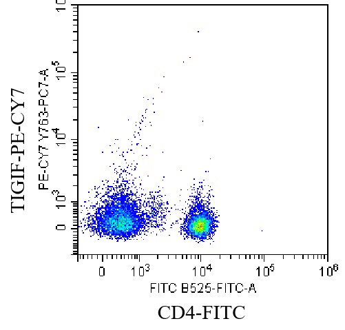 • Staining of normal human peripheral blood mononuclear cells (PBMCs) using PE-Cy7 TIGIT Antibody (Clone: MBSA43) (Selleck Cat#: H1309) and FITC CD4 Antibody. Analyzed data are derived from lymphocytes.