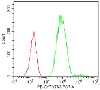 • Staining of J774A.1 cell line cells using PE-CY7 Anti-TLR4/MD-2 Complex Antibody (Clone: MTS510) (Product No.: G3424) (green, red is blank control). Analyzed data are derived from live cells.