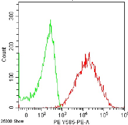 • Staining of MC/9 cell line using PE Anti-FCER1A Antibody (Clone: MAR-1) (Product No.: G0752) (red, green is unstained control). Analyzed data are derived from total cells.