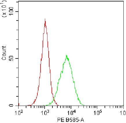 • Staining of U937 cells stimulated with GM-CSF and IFN-γ with PE anti-human HLA-G Antibody (Clone: 87G) (Product Code: H2747) (green, red is unstained control). Analysis data derived from total cells.