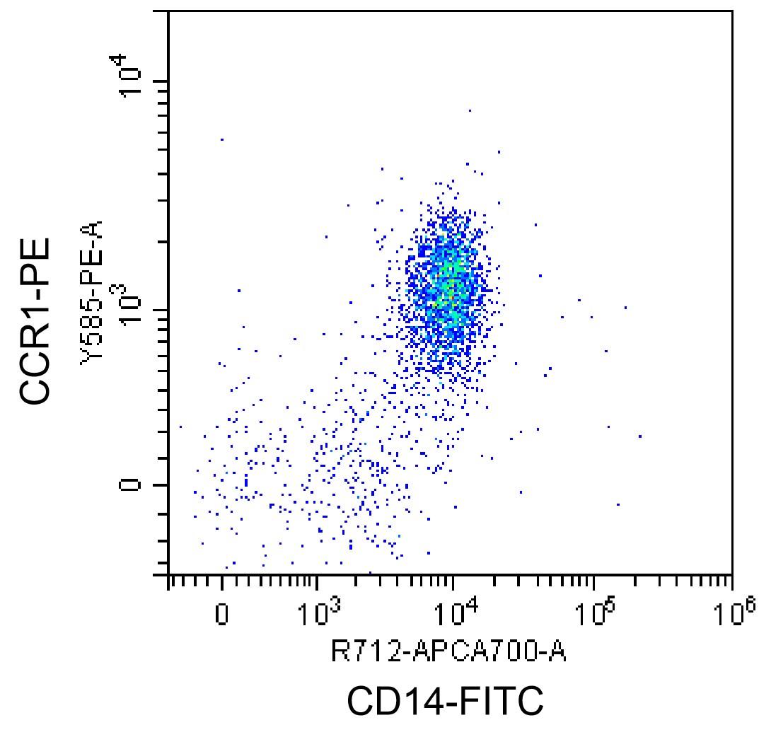 • Staining normal human peripheral blood mononuclear cells (PBMCs) with PE Human CCR1 Antibody (Clone: 53504) (Product Number: H1862), and FITC CD14 Antibody. Analysis was performed on monocytes.