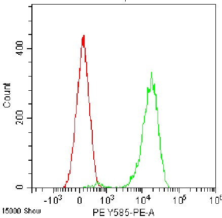 • Staining of normal human peripheral blood lysed with ammonium chloride red blood cell lysis buffer using PE Anti-Human CD10 Antibody (Clone: HI10a) (Product No.: H1457) (green, red is blank control). Analyzed data are derived from total live cells.
