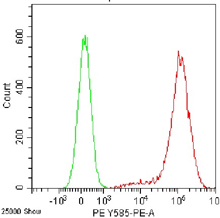 • Staining of Jurkat cell line cells using PE Anti-Human CD107a Antibody (Clone: H4A3) (Product No.: H0452) (Red, Green: Blank Control). Analyzed data are derived from live cells.