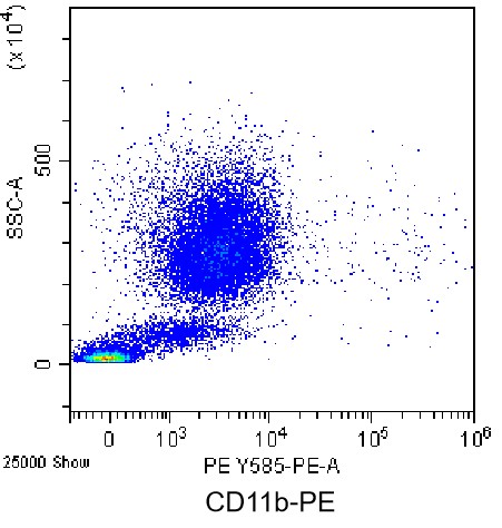 • Staining of normal human peripheral blood red blood cell-lysed using ammonium chloride lysis buffer using PE Anti-Human CD11b Antibody (Clone: CBRM1/5) (Product No.: H0077). Analyzed data are derived from total live cells.