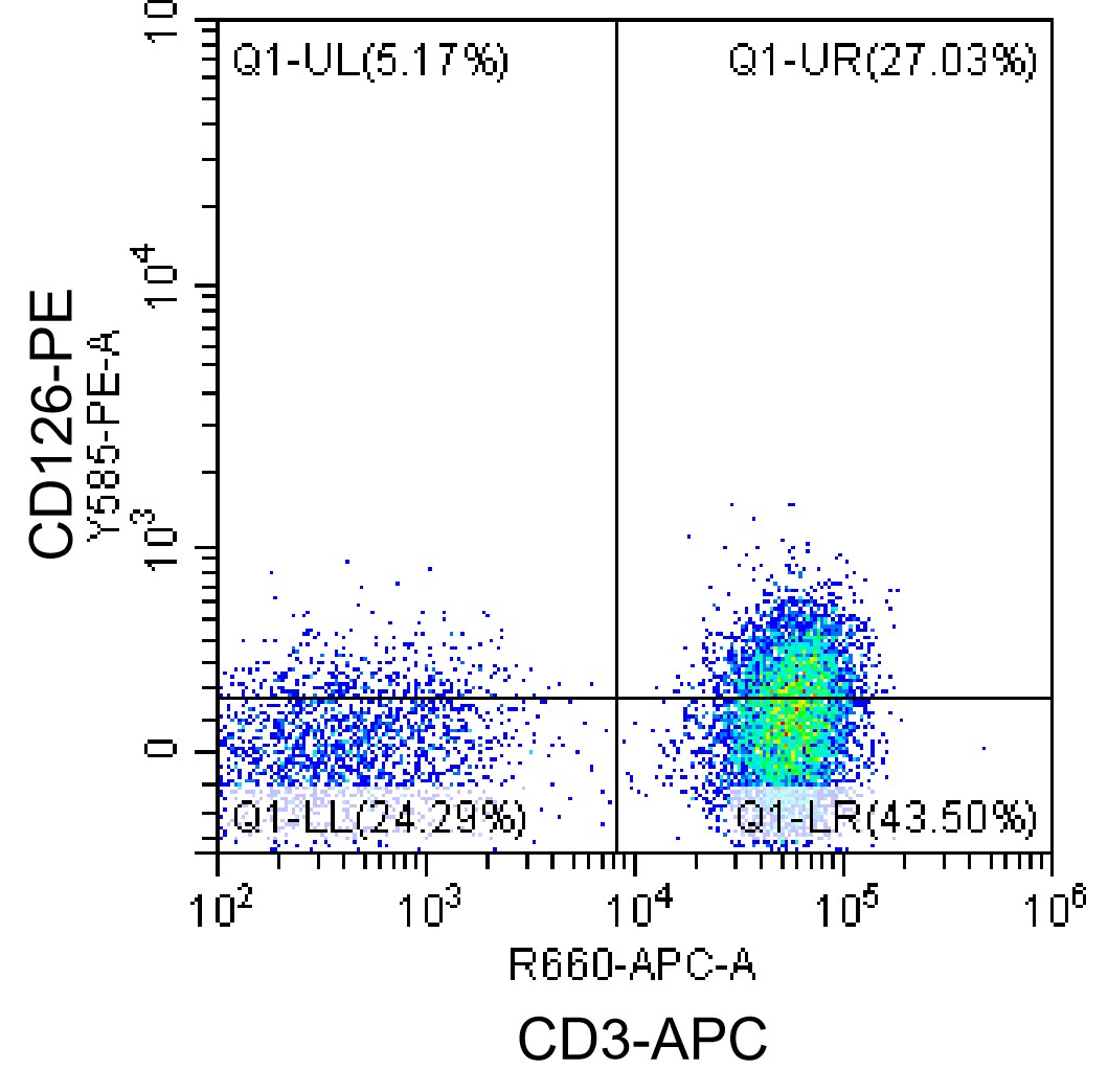 CD126是一种80 kDa的IL-6受体α链,也称为IL-6R。它是免疫球蛋白超家族的成员,在浆细胞、T细胞、活化的B细胞、单核细胞、粒细胞、肝细胞、上皮细胞和成纤维细胞上表达。功能性IL-6受体由CD126和IL-6受体β链(CD130或gp130)的非共价结合形成。CD126以低亲和力结合IL-6但不传递信号。β链(gp130,CD130)本身不结合IL-6,但与α链/IL-6复合物结合以启动信号转导。