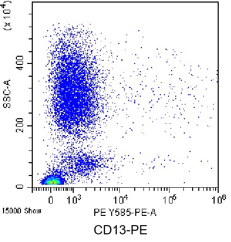 • Staining of normal human peripheral blood lysed with ammonium chloride red blood cell lysis buffer using PE Anti-Human CD13 Antibody (Clone: WM15) (Product No.: H3332). Analyzed data are derived from total live cells.