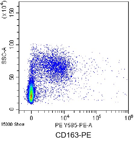 • Staining of normal human peripheral blood mononuclear cells (PBMCs) using PE Anti-Human CD163 Antibody (Clone: GHI/61) (Product No.: H3497). Analyzed data are derived from total cells.