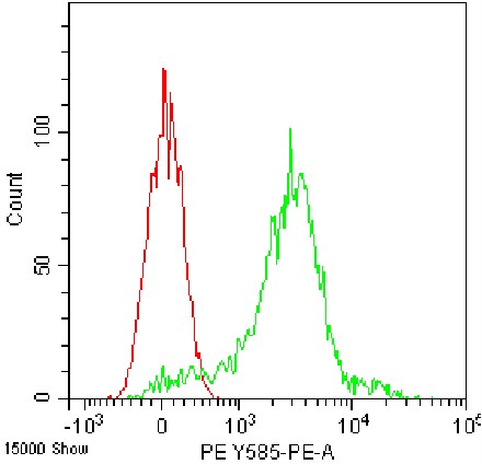 • Staining of normal human peripheral blood mononuclear cells (PBMCs) using PE Anti-Human CD166/ALCAM Antibody (Clone: 3A6) (Product No.: H2822) (Green, red is blank control). Analyzed data are derived from monocytes.