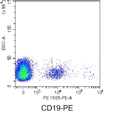 • Staining of normal human peripheral blood mononuclear cells (PBMCs) using PE Anti-Human CD19 Antibody (Clone: HIB19) (Product No.: H0002). Analyzed data are derived from lymphocytes.