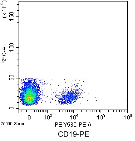 • Staining of normal human peripheral blood mononuclear cells (PBMCs) using PE Anti-Human CD19 Antibody (Clone: LT19) (Product No.: H0017). Analyzed data are derived from lymphocytes.
