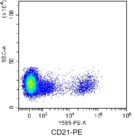 • Staining of normal human peripheral blood mononuclear cells (PBMCs) with PE anti-human CD21 Antibody (Clone: B-ly4) (Product Code: H2297). Analysis data derived from lymphocytes.
