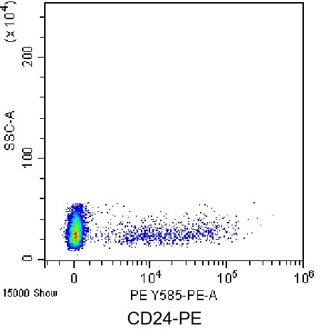 • Staining of normal human peripheral blood mononuclear cells (PBMCs) using PE Anti-Human CD24 Antibody (Clone: ML5) (Product No.: H0317). Analyzed data are derived from lymphocytes.